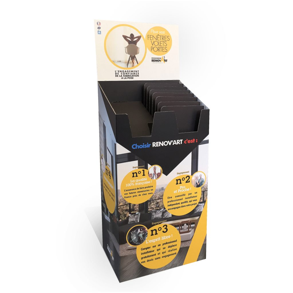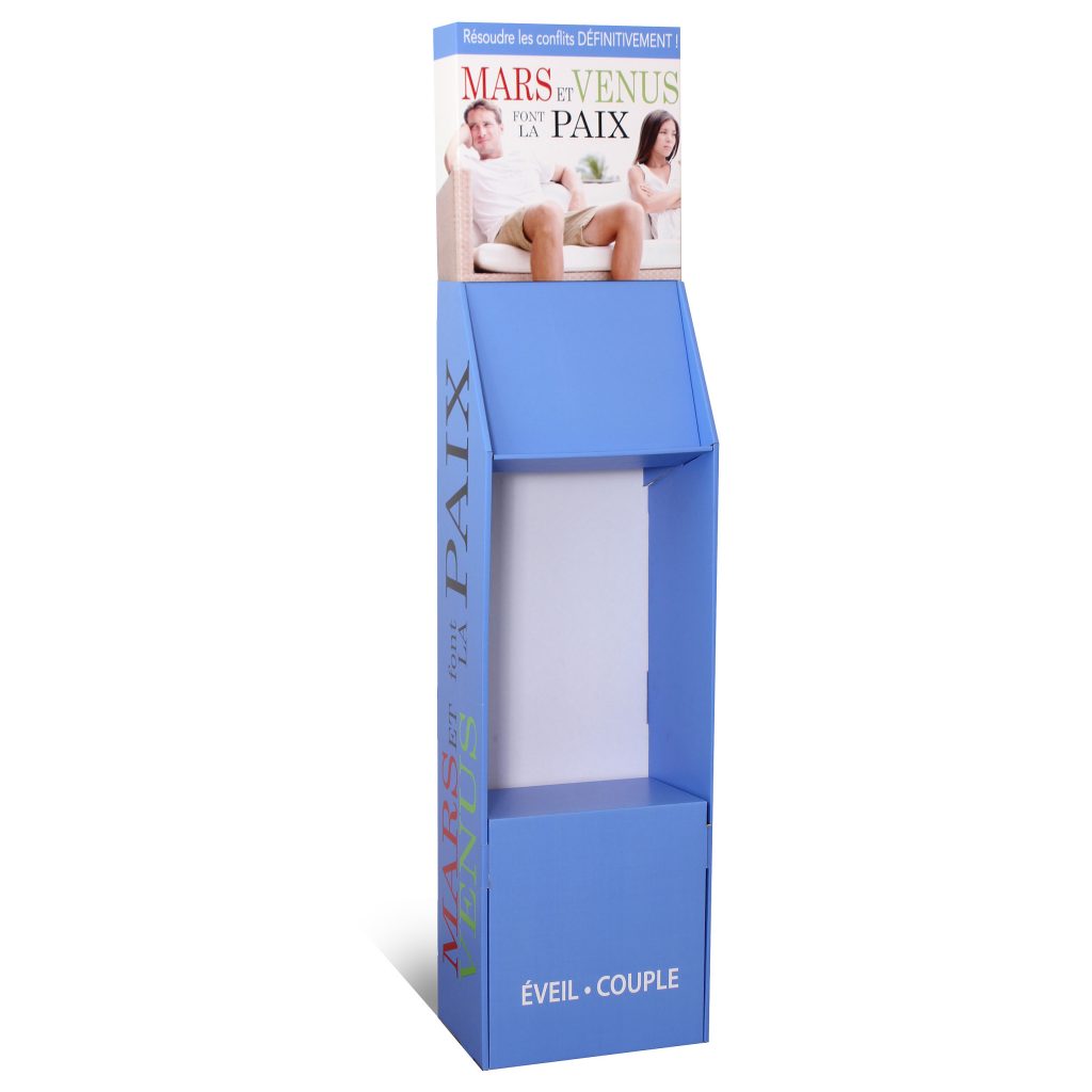 Les box et display en carton sont des PLV à prix raisonné, qui offrent une large place à la communication. On peut y ajouter un fronton, un porte-flyer, des séparateurs… confiez-vous votre cahier des charges et nous vous conseillerons. Notre Bureau d’Etudes conçoit les formes, vous présente des simulations en 3D et nous fabriquons des prototypes lorsque c’est utile. Nous livrons en colis unitaire et à plat, avec une notice si le montage le nécessite.