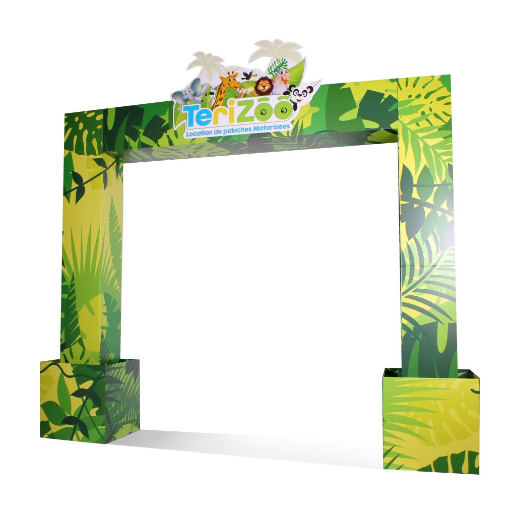 La version arche en carton est tout aussi simple de montage et d’utilisation. Elle est aussi personnalisable sur toutes ses faces visibles et particulièrement appréciée pour matérialiser un espace, enjamber des produits, encadrer, accueillir, célébrer…